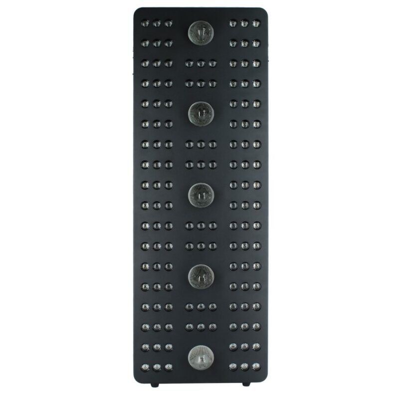 5 Bulbi centrali da 200 Watt, con lenti che collimano il fascio luminoso a 30° e che utilizzano la lunghezza d’onda di 670 nm per un miglior trattamento ed efficacia.