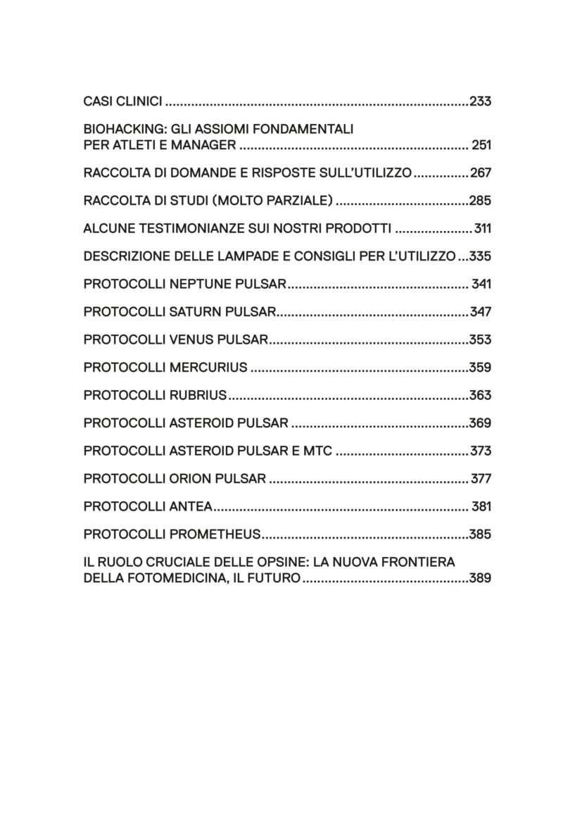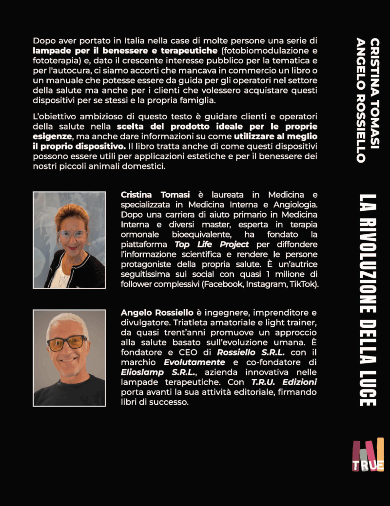 Dopo aver portato in Italia nelle case di molte persone una serie di lampade per il benessere e terapeutiche (fotobiomodulazione e fototerapia) e, dato il crescente interesse pubblico per la tematica e per l’autocura, ci siamo accorti che mancava in commercio un libro o un manuale che potesse essere da guida per gli operatori nel settore della salute ma anche per i clienti che volessero acquistare questi dispositivi per sé stessi e la propria famiglia.
